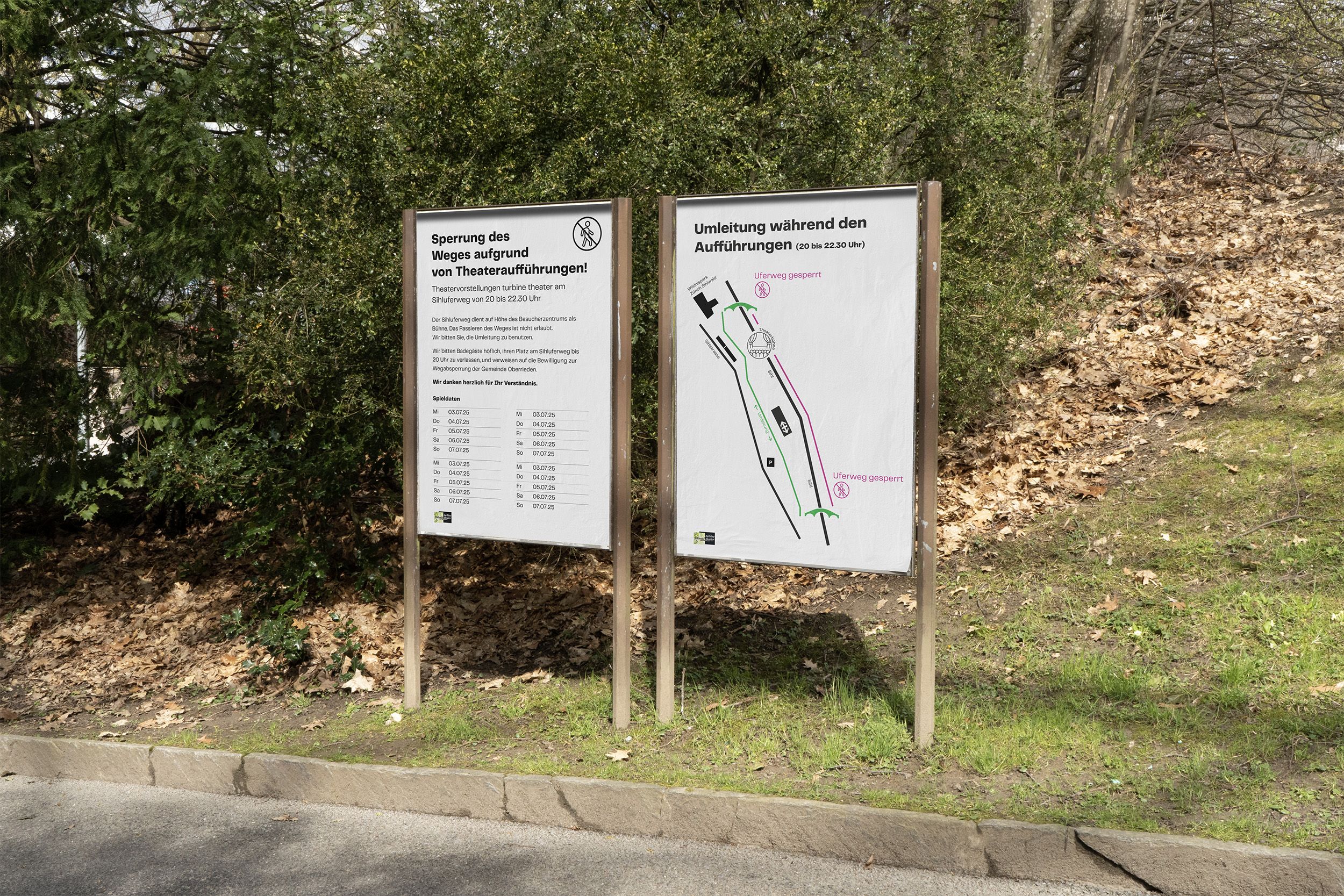 Gelände-Beschilderung im Sihlwald: Visuelle Führung durch das Gelände — von Wegweisern bis Bühnenhinweisen — in einheitlichem Design
